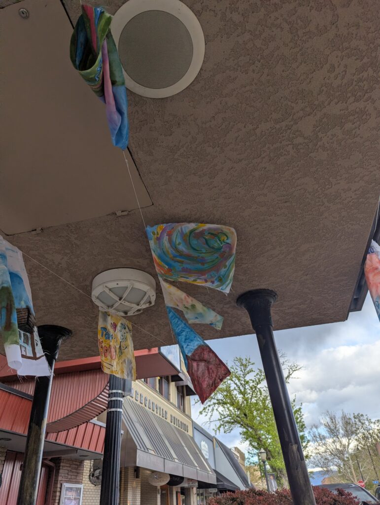 During her session, we created a collaborative piece using cut-up fabric. We each painted a piece and later strung them together like prayer flags, which were hung above a covered park bench in Downtown Grand Junction.