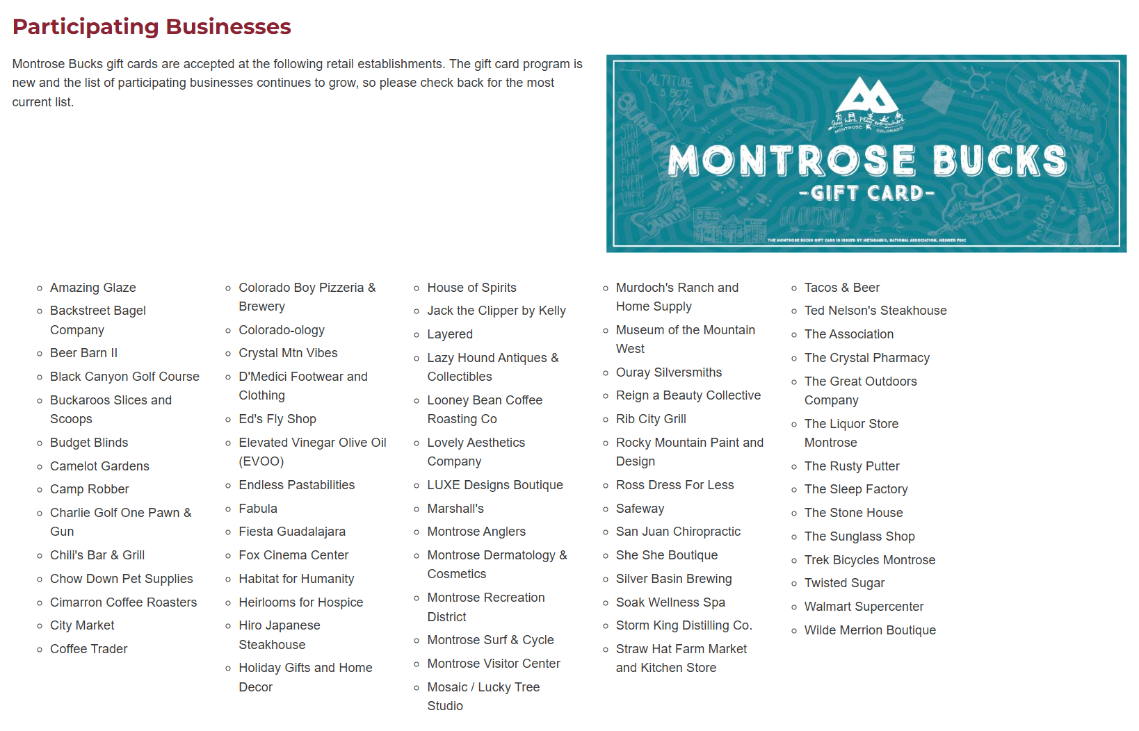 The Montrose Bucks program supports local businesses by encouraging residents to spend dollars within the community. Currently, the program operates using plastic gift cards. To reduce costs, improve accessibility, and modernize the program, the City of Montrose will transition from the plastic card system to a digital gift card platform.