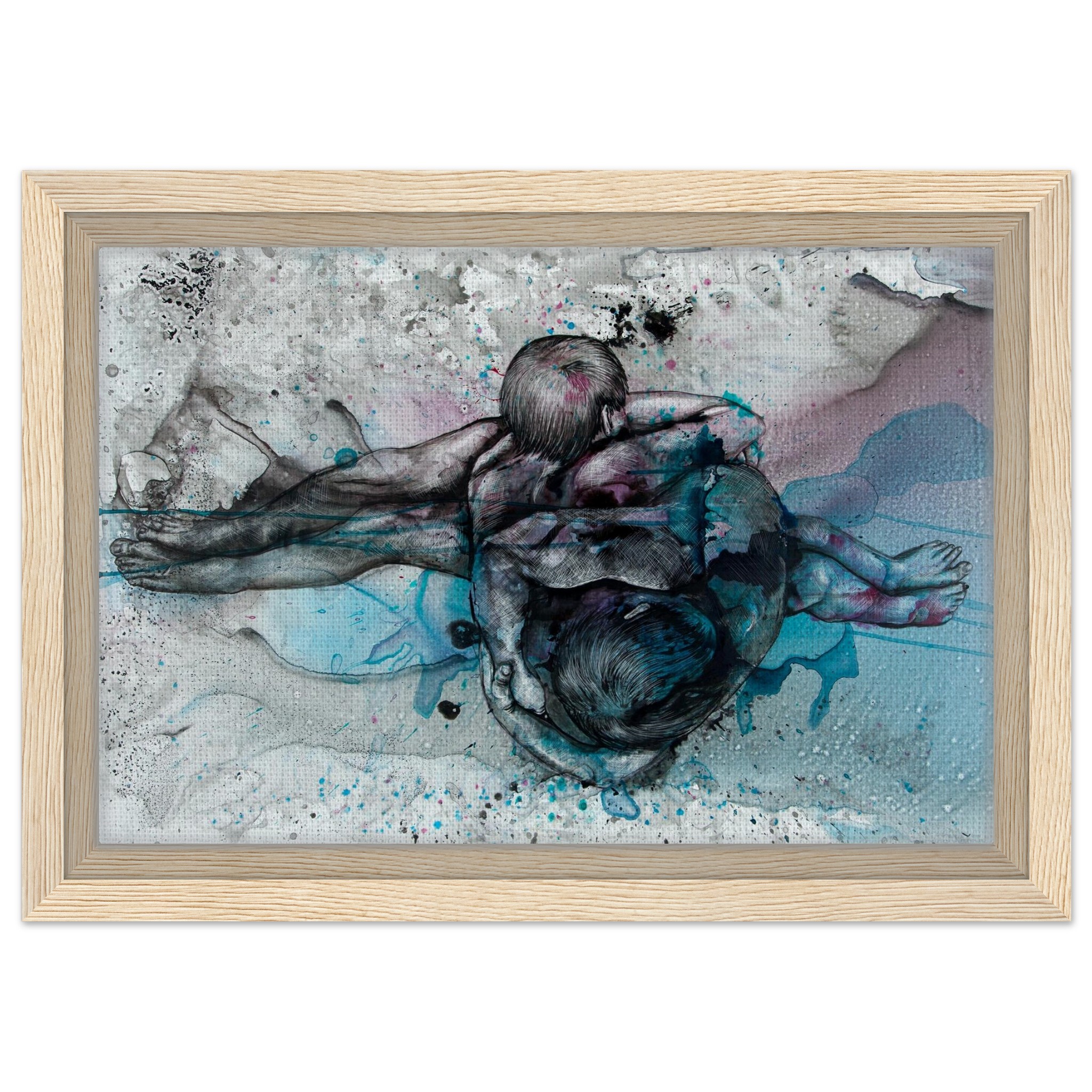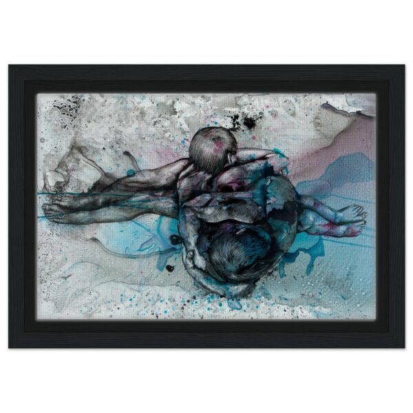 Ink on clay board gives life to Balance, a black and white depiction of two figures entwined in an embrace that mirrors the graceful symmetry of a yin-yang. Behind them, splashes of red, blue, and black ink evoke the chaotic forces of emotion, conflict, and passion—but the figures themselves remain grounded, unified. Their pose reflects duality and harmony, a tender moment that speaks to the equilibrium we find in connection with another. This piece is both bold and meditative, exploring themes of unity, contrast, and inner stillness.